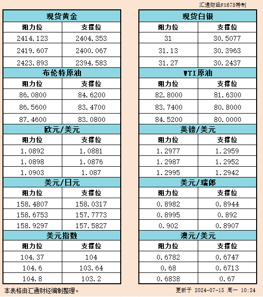 7月15日亚市支撑阻力:金银原油+美元指数等六大货币对