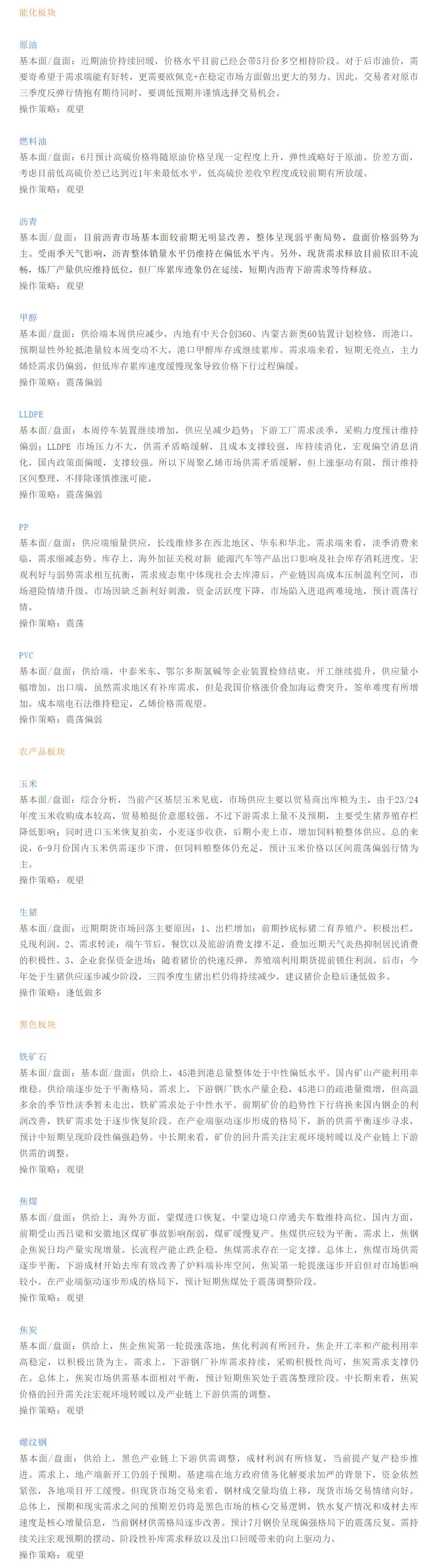 以下是恒泰期货今日早间交易策略,覆盖品种有:宏观分析、原油燃料油等能源化工、玉米生猪等农产品、黑色系如铁矿石焦煤焦炭螺纹钢、有色系如工业硅碳酸锂等。