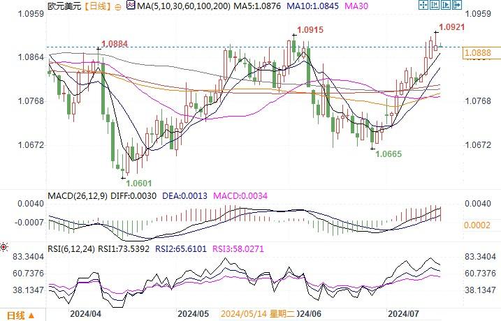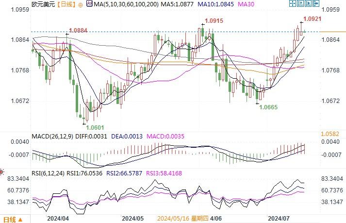 欧元兑美元达到了五周以来的最高水平,周一(7月15日)延续涨势,一度触及17周以来的高点1.0921,