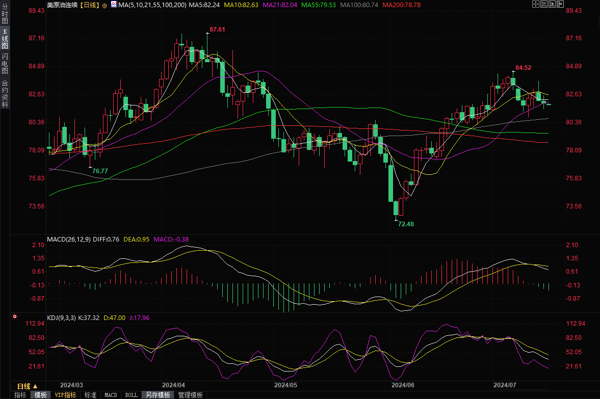 本交易日关注美国6月零售销售月率和API原油库存系列数据,关注地缘局势和美国大选相关消息,留意美联储官员讲话。技术面来看,日线级别,油价在近三个月高点附近受阻后回落,MACD死叉,KDJ死叉,尽管在100日均线附近获得支撑后反弹,但在10日明显附近再度受到明显压制,后市油价面临进一步回调风险,短线继续留意100日均线80.74附近支撑,然后关注80关口支撑,若下破该支撑,则增加后市看空信号。