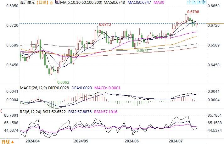 澳元兑美元持平于0.6730美元。澳元/美元在亚洲小幅走高,因美联储降息押注引发风险资产大涨,而且美国公债收益率下降给到澳元相应的支撑。 但澳元的上行空间受限,主要是疲软的中国经济数据引发需求的担忧导致大宗商品价格下降,继续打压了澳元的人气。目前市场将聚焦周四澳洲就业数据,该数据将是澳央行利率预期的关键。若就业数据呈增长势头,则会令市场对澳联储预期降息的时点更为延后,从而与美联储的利率分化更为明显。澳元或会从中得到支撑而回升。相反,若数据呈弱,澳元/美元恐怕要延续回撤的走势。从日线图上观察,前期横盘区间高点0.6705-15现为坚实支撑位;上方阻力位依次在0.6765-70、0.6800。