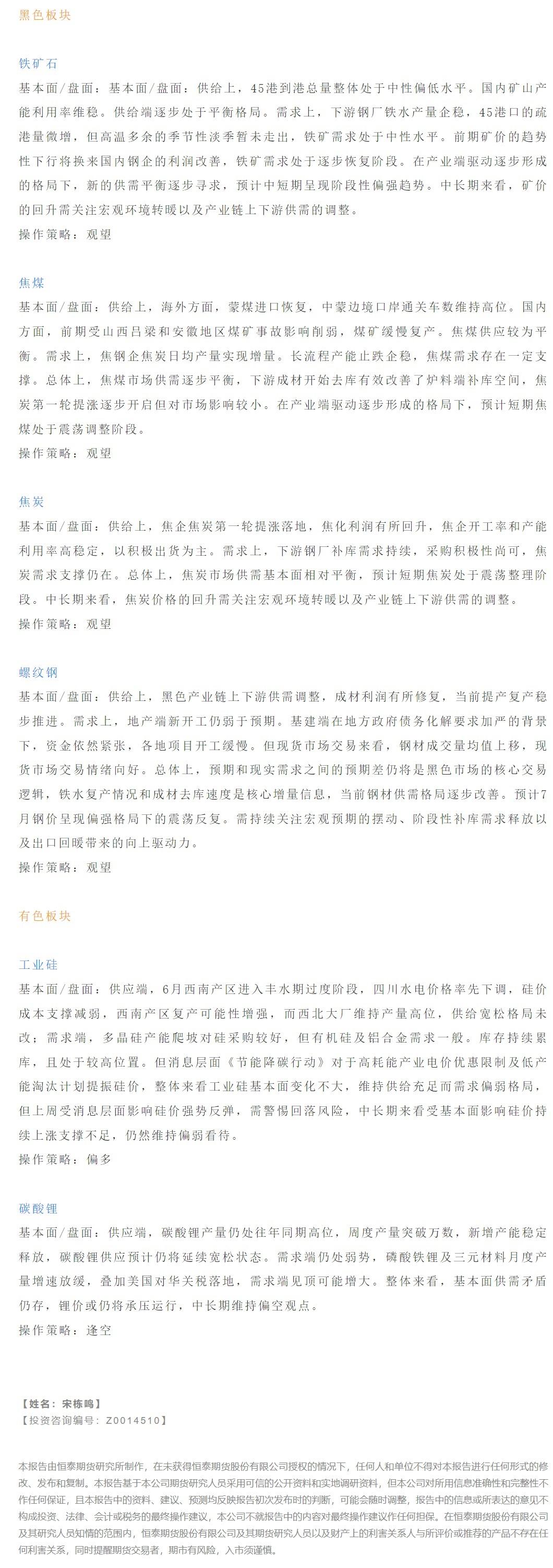 以下是恒泰期货今日早间交易策略,覆盖品种有:宏观分析、原油燃料油等能源化工、玉米生猪等农产品、黑色系如铁矿石焦煤焦炭螺纹钢、有色系如工业硅碳酸锂等。
