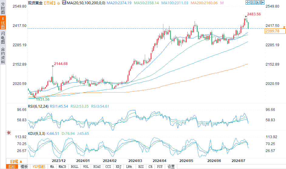 现货黄金报2399.95美元/盎司,跌幅1.85%。