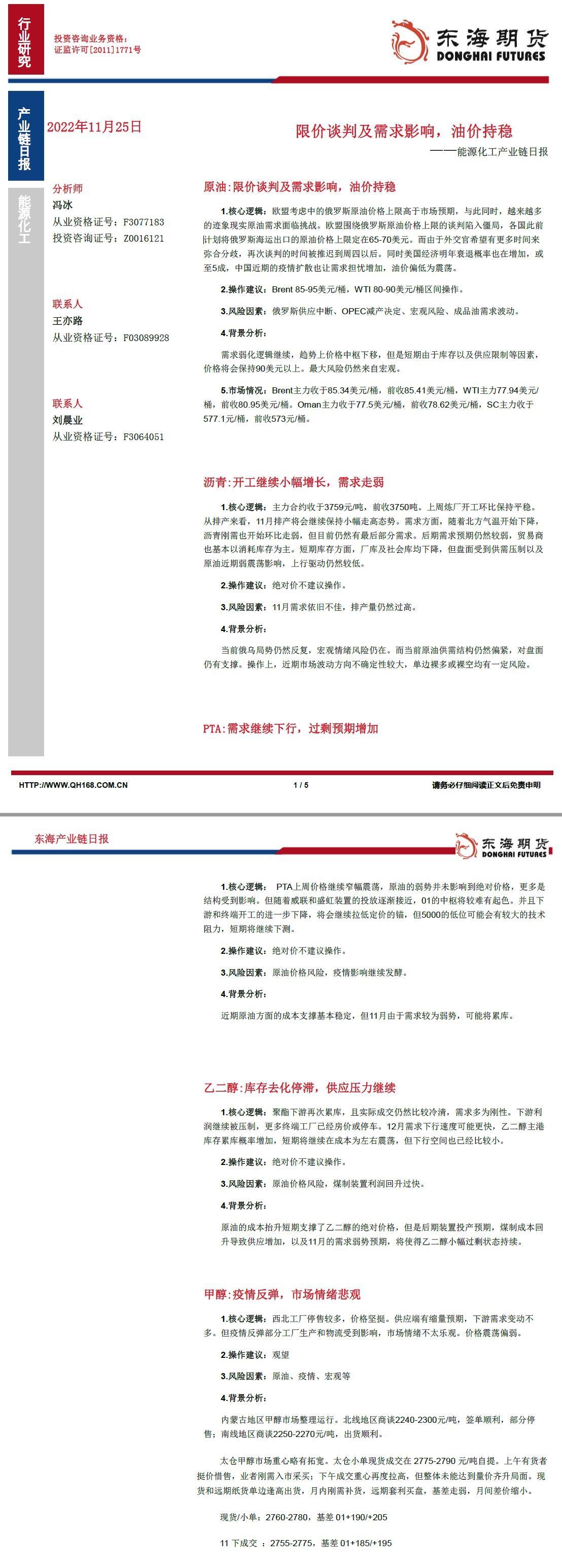 标题:【东海期货11月25日产业链日报】能化篇:限价谈判及需求影响,油价持稳