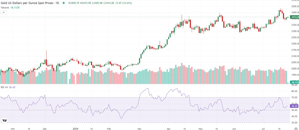 现货黄金周二收盘上涨13.01美元,涨幅0.54%,报2409.16美元/盎司。