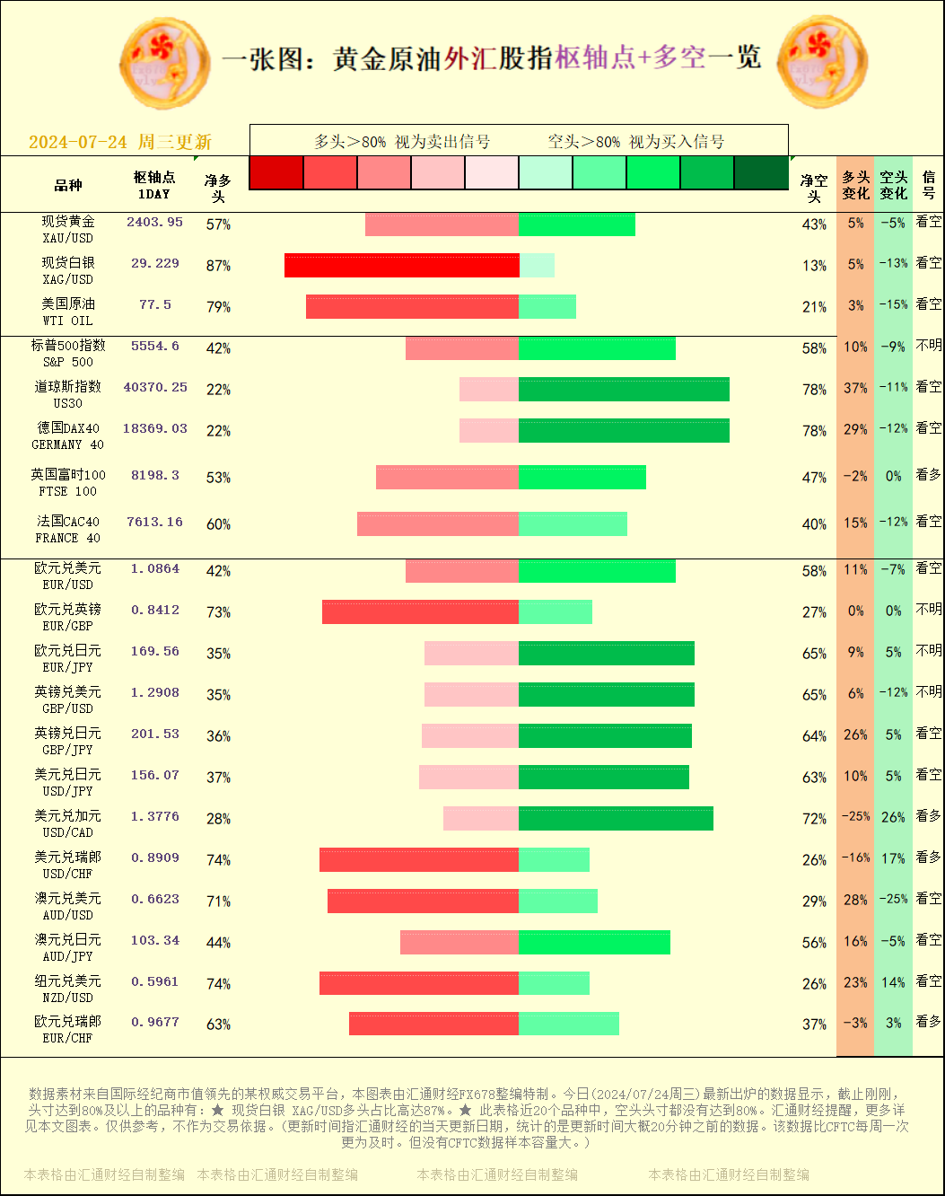 标题:一张图:2024/07/24黄金原油外汇股指"枢纽点+多空占比"一览