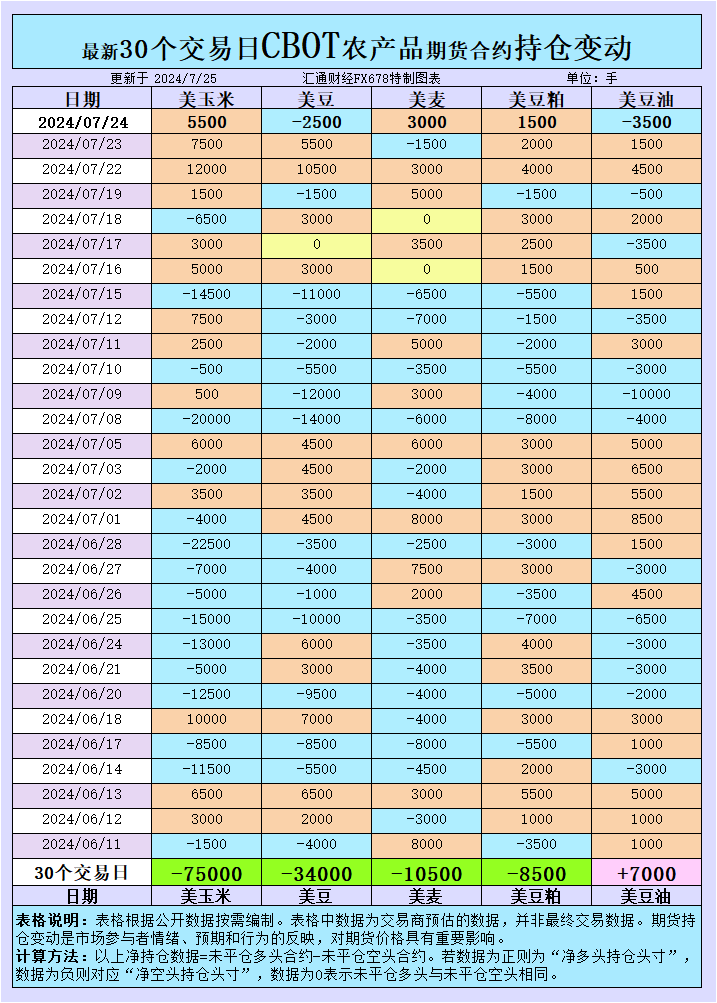 汇通财经APP讯——周四(7月25日),美国农产品市场经历了一系列显著的持仓变动和价格波动。大宗商品基金在CBOT的大豆、玉米、小麦和豆油上的持仓策略调整,反映出市场对全球供应充足预期的担忧,以及对北美部分地区干旱天气可能影响产量的谨慎态度。本文深入分析了大豆、玉米、小麦和豆油市场的最新动态,探讨了持仓变动背后的市场情绪,以及这些变化对今日交易策略的潜在影响。