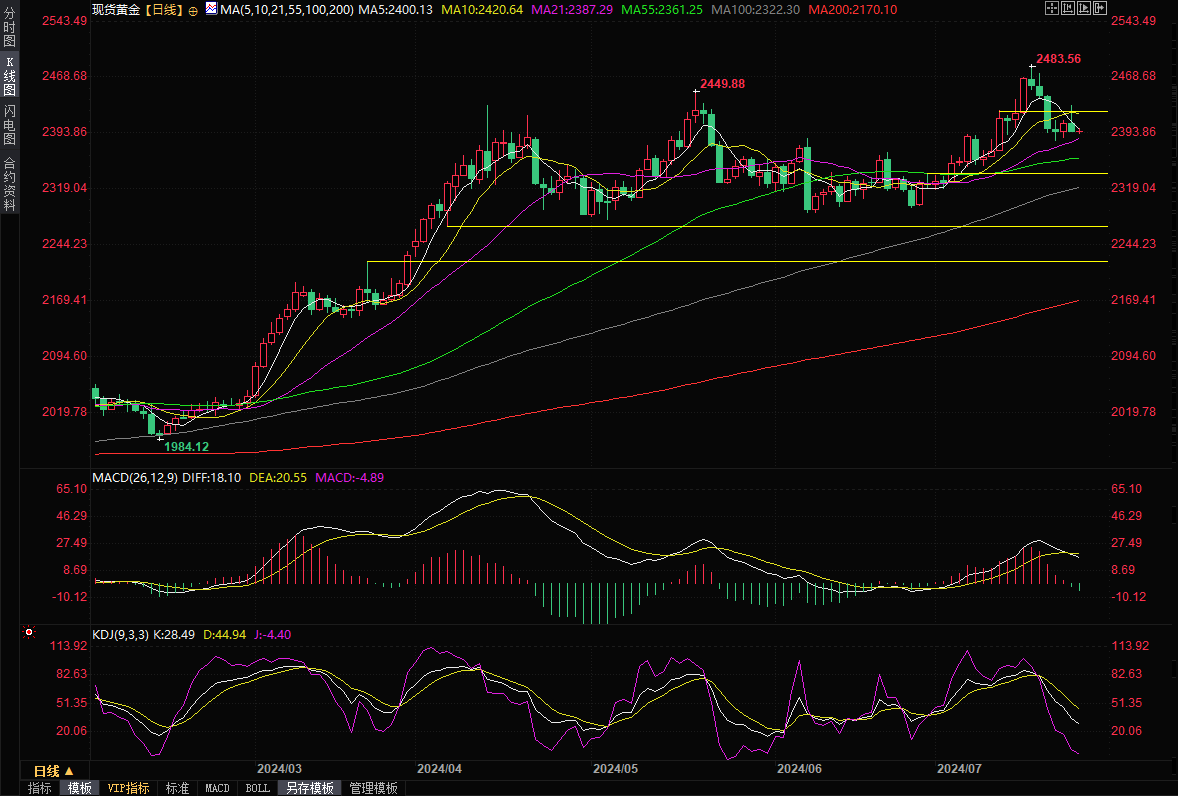 现货黄金窄幅震荡,目前交投于2396.76美元/盎司附近。周三金价冲高回落,早些时候因为市场对美联储年内将降息两次的预期升温,美元下跌,金价一度甚至升至2431.87美元/盎司,但美国7月综合采购经理人指数(PMI)初值升至2022年4月以来最高,10年期美债收益率反弹至近两周高位,令金价由涨转跌,收报2397.08美元/盎司。