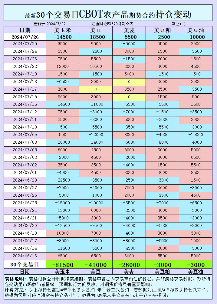 增加CBOT玉米投机性净空头;增加CBOT大豆投机性净空头;增加CBOT小麦投机性净空头;增加CBOT豆粕投机性净空头;增加CBOT豆油投机性净空头。