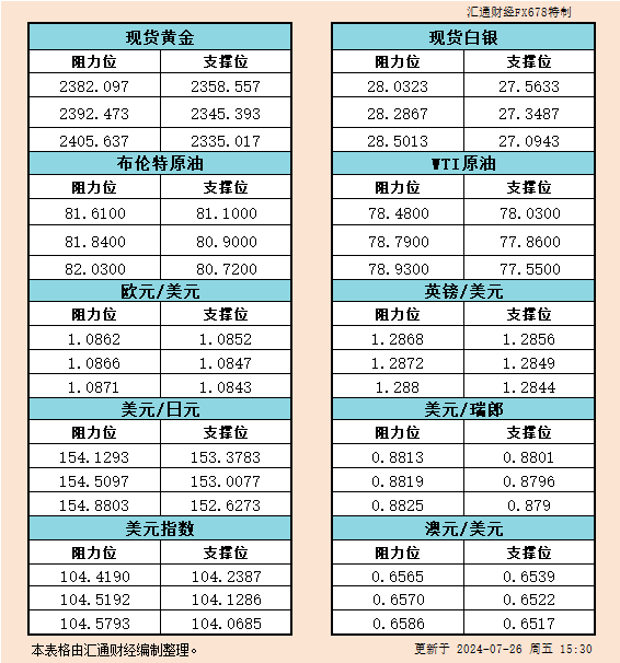 标题:7月26日欧市支撑阻力:金银原油+美元指数等六大货币对