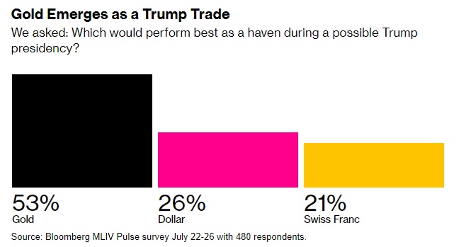 汇通财经APP讯——根据美国彭博社的Markets Live Pulse周一(7月29日)最新发布的一份调查,如果特朗普(Donald Trump)重新入主美国白宫,黄金是最好的投资组合对冲工具。