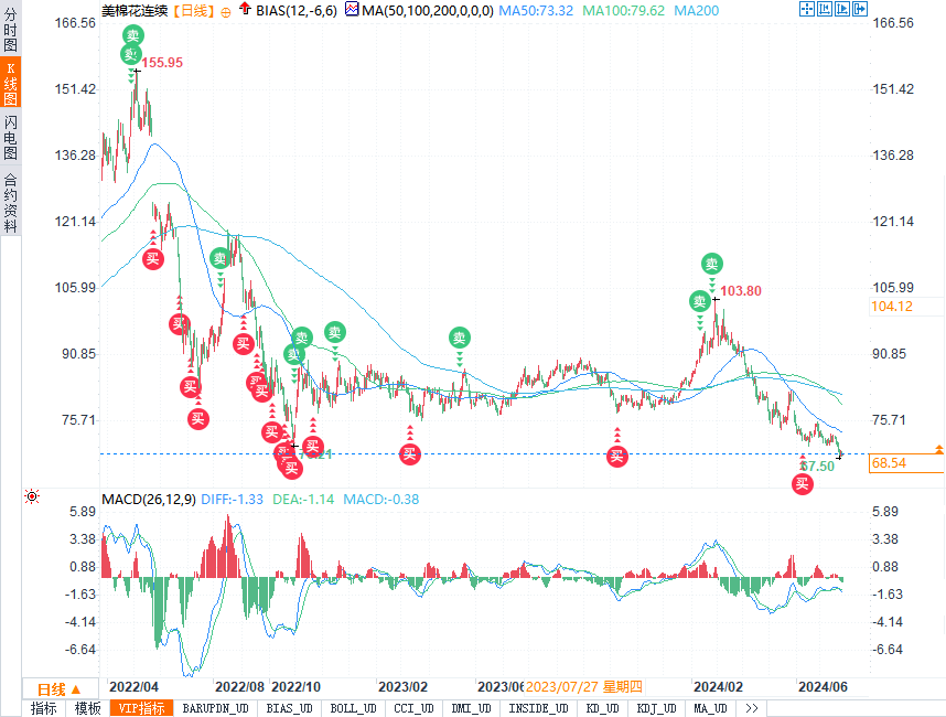 棉花期货价格的下跌趋势已经形成。纽约棉花期货价格已跌至每磅67-68美分,为近四年来的最低水平。这一价格的下跌,反映了市场对棉花供应过剩的担忧。同时,市场情绪也受到了国际市场低迷的影响,恐慌性抛售现象时有发生。