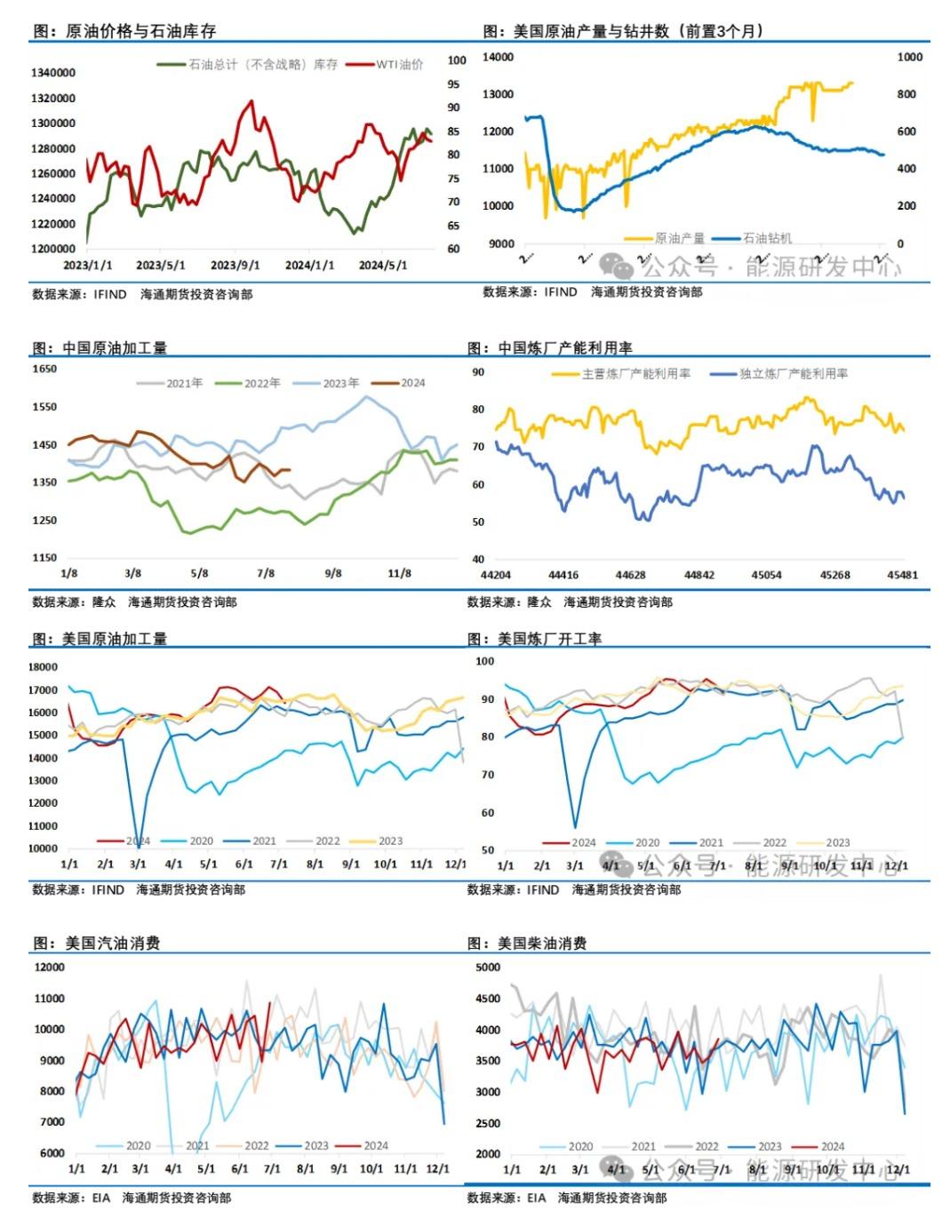 07月19日公布的最新一期EIA周度数据显示当周美国除却战略储备的商业原油库存减少374.1万桶至4.36亿桶,降幅0.85%。库欣库存减少170.8万桶。汽油库存减少557.2万桶,预期减少39.1万桶;精炼油库存减少275.3万桶,预期增加24.9万桶。美国至7月12日当周除却战略储备的商业原油库存为2024年2月9日当周以来最低。战略石油储备库存为2022年12月23日当周以来最高。美国至7月12日当周EIA汽油库存增幅录得2024年1月19日当周以来最大。EIA报告:07月19日当周美国原油出口增加22.2万桶/日至418.6万桶/日。美国至7月19日当周除却战略储备的商业原油库存为2024年2月2日当周以来最低;EIA战略石油储备库存为2022年12月23日当周以来最高;EIA汽油库存降幅录得2024年3月8日当周以来最大;EIA汽油库存降幅录得2024年3月8日当周以来最大。成品油消费端来看,成品油表需环比明显回升,各类主要油品表需走强。出行方面,主要油品汽油和航煤均有不同程度的回升;工业油品方面,馏分油表需和丙烷&丙烯表需也均有回升。整体上这是一份对油价非常友好的报告。相对于美国旺季需求表现尚可,国内原油市场表现仍较为平淡,高频数据显示国内原油加工量基本平稳较上一期变化不大,虽然国内成品油裂解差受益于原油回落出现反弹,但终端需求仍是低迷,成品油价格仍在回落,业内信心仍处于低位。不过整体来看整体消费旺季下原油市场整体供需压力不大。