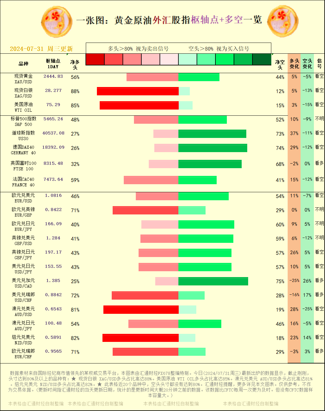 【本图表涉及到的交易品种有:现货黄金、现货白银、美国原油、标普500指数、道琼斯指数、德国DAX40、欧元兑美元、欧元兑英镑、欧元兑日元、欧元兑澳元、英镑兑美元、美元兑日元、美元兑加元、美元兑瑞郎、澳元兑美元、澳元兑日元、加元兑日元、纽元兑美元、美元兑离岸人民币、。】(更新时间指汇通财经的当天更新日期,统计的是隔天交易日的数据,比如本周三统计的是截止本周二交易结束时的数据。该数据比CFTC每周一次更为及时。) 标题:一张图:2024/07/31黄金原油外汇股指"枢纽点+多空占比"一览