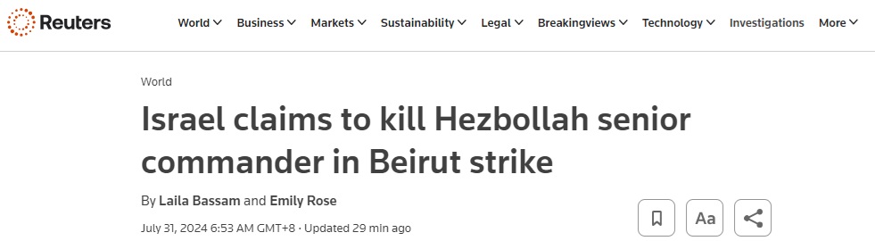 英国路透社最新报道称,以色列军方声称,它在周二对贝鲁特的空袭中击毙了真主党(Hezbollah)高级指挥官,这是对三天前发生的一次跨境火箭弹袭击的报复。三天前,真主党发动了一次越境火箭弹袭击,造成12名年轻人死亡。