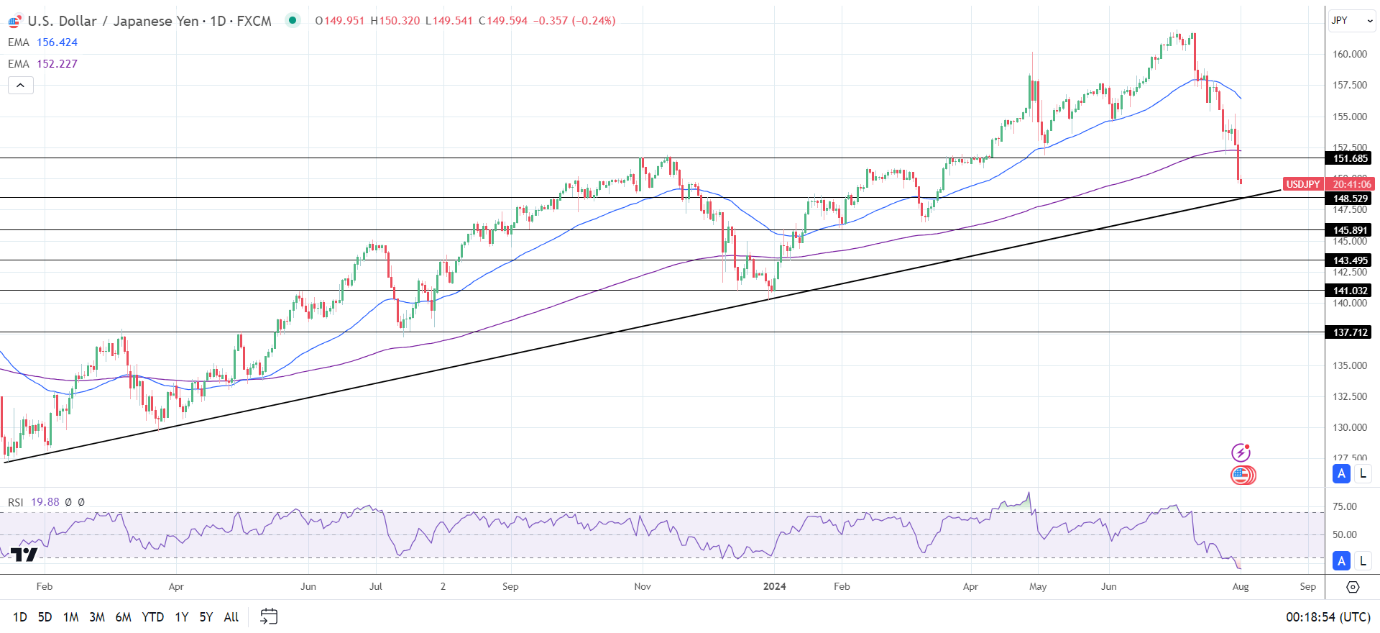 汇通财经APP讯——周四(8月1日),美元/日元短线大跌触及148.50后,微幅回升至149.65。日本央行将利率上调至0.25%,达到2008年以来的最高水平,并释出超鹰派信号。美联储则维持利率不变,并且主席鲍威尔释出9月鸽派降息的重要暗示。